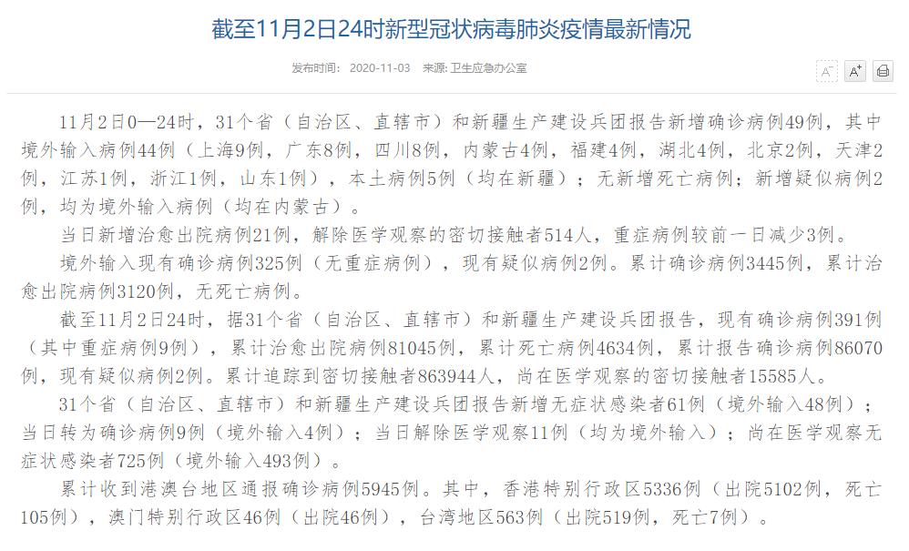 人民網(wǎng)北京11月3日電(董童)國家衛(wèi)生健康委于今日在官網(wǎng)發(fā)布的《截至11月2日24時(shí)新型冠狀病毒肺炎疫情最新情況》(以下簡稱“情況”)指出,11月2日0—24時(shí),31個(gè)?。ㄗ灾螀^(qū)、直轄市)和新疆生產(chǎn)建設(shè)兵團(tuán)報(bào)告新增確診病例49例,其中境外輸入病例44例(上海9例,廣東8例,四川8例,內(nèi)蒙古4例,福建4例,湖北4例,北京2例,天津2例,江蘇1例,浙江1例,山東1例),本土病例5例(均在新疆);無新增死亡病例;新增疑似病例2例,均為境外輸入病例(均在內(nèi)蒙古)。當(dāng)日新增治愈出院病例21例,解除醫(yī)學(xué)觀察的密切接觸者514人,重癥病例較前一日減少3例。
