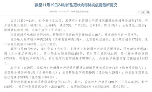 情況顯示,截至11月19日24時,據(jù)31個省(自治區(qū)、直轄市)和新疆生產(chǎn)建設兵團報告,現(xiàn)有確診病例311例(其中重癥病例1例),累計治愈出院病例81453例,累計死亡病例4634例,累計報告確診病例86398例,現(xiàn)有疑似病例1例。累計追蹤到密切接觸者875061人,尚在醫(yī)學觀察的密切接觸者12412人。