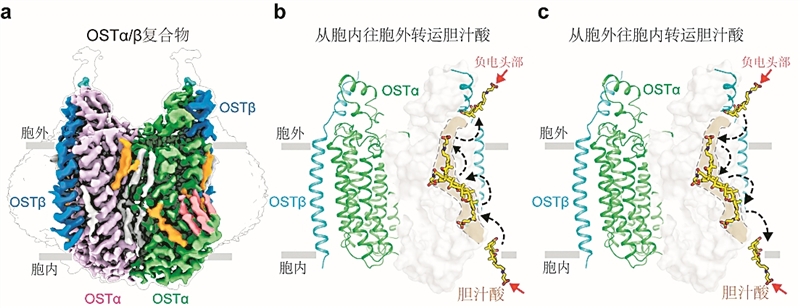 “這種‘滑梯’機(jī)制極其巧妙。”姜道華說,它不需要腺嘌呤核苷三磷酸(ATP)或離子梯度等額外能量來驅(qū)動(dòng)蛋白變形,只需利用膽汁酸自身的濃度差,就能實(shí)現(xiàn)高效雙向轉(zhuǎn)運(yùn)。這完美解釋了OSTα/β作為被動(dòng)轉(zhuǎn)運(yùn)蛋白,為何能保證膽汁酸的高效回收。