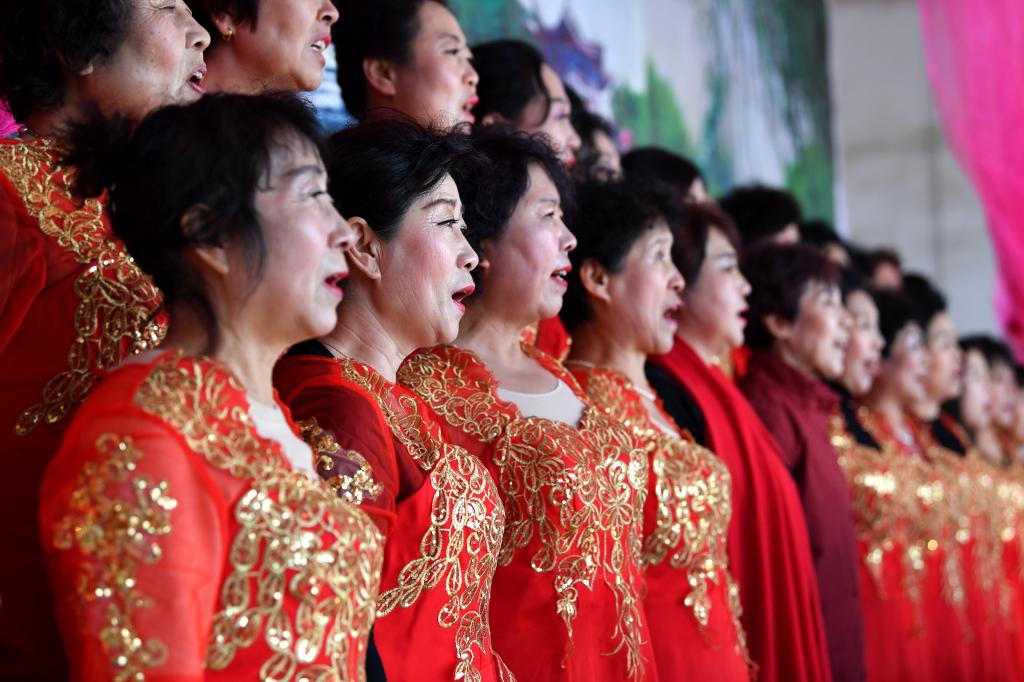 ↑1月3日,在山西省渾源縣荊莊村,渾源縣貧困山區(qū)合唱團在表演歌舞《看山看水看中國》。
