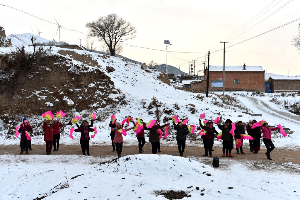 ↑1月2日,在山西省渾源縣山陰山村,村民在練習(xí)渾源縣貧困山區(qū)合唱團新教的秧歌。