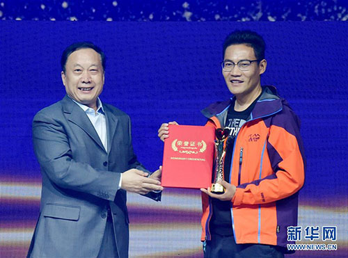 1月18日,“環(huán)保衛(wèi)士”次仁旦達(dá)(右)上臺領(lǐng)獎。 當(dāng)日,新華社主辦的“中國網(wǎng)事·感動2018”年度頒獎典禮在中國傳媒大學(xué)舉行,10位“草根”成為舞臺上最閃亮的明星。新華社記者 李賀 攝