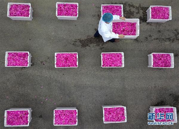 2018年4月21日,在貴州省鎮(zhèn)遠(yuǎn)縣青溪鎮(zhèn)一家以鮮花為原料釀酒的企業(yè),工人在搬運玫瑰花(無人機拍攝)。新華社發(fā)(蔡興文 攝)