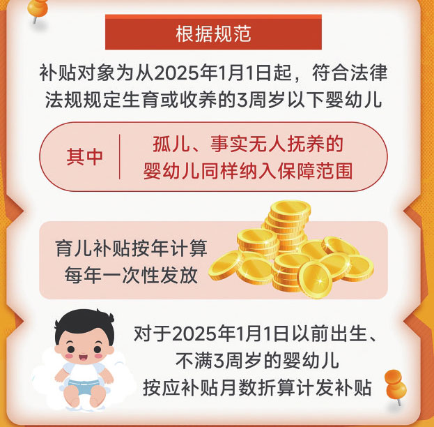 根據(jù)規(guī)范,補貼對象為從2025年1月1日起,符合法律法規(guī)規(guī)定生育或收養(yǎng)的3周歲以下嬰幼兒,其中,孤兒、事實無人撫養(yǎng)的嬰幼兒同樣納入保障范圍。育兒補貼按年計算,每年一次性發(fā)放。對于2025年1月1日以前出生、不滿3周歲的嬰幼兒,按應補貼月數(shù)折算計發(fā)補貼。