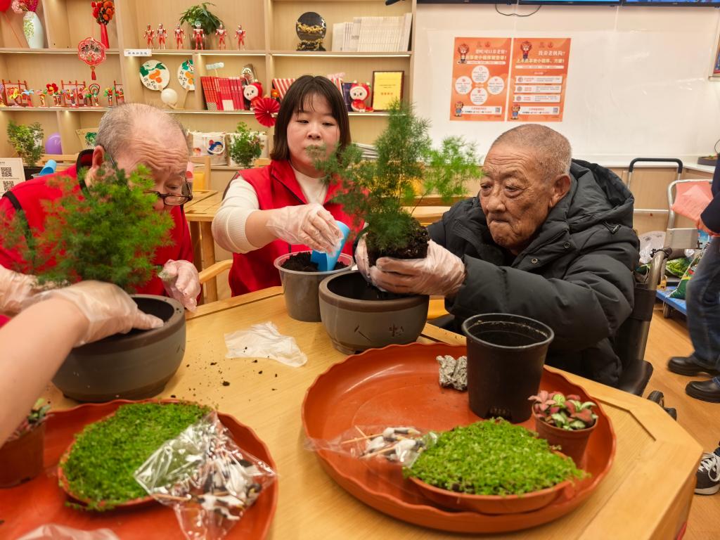 10月24日,在北京市豐臺區(qū)北宮鎮(zhèn)養(yǎng)老服務(wù)中心,志愿者正手把手教老人制作“松鶴延年”盆景。(新華社記者夏子麟 攝)