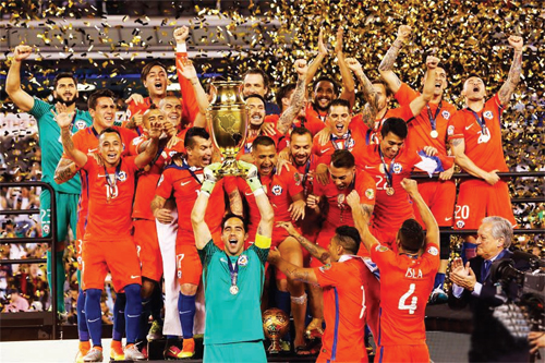 6月26日,智利隊門將布拉沃(前左一)在頒獎儀式上捧杯慶祝奪冠。當(dāng)日,2016年百年美洲杯決賽在美國新澤西舉行,智利隊與阿根廷隊在120分鐘內(nèi)0比0戰(zhàn)平,智利隊在點球大戰(zhàn)中以4比2戰(zhàn)勝阿根廷隊,奪得冠軍。