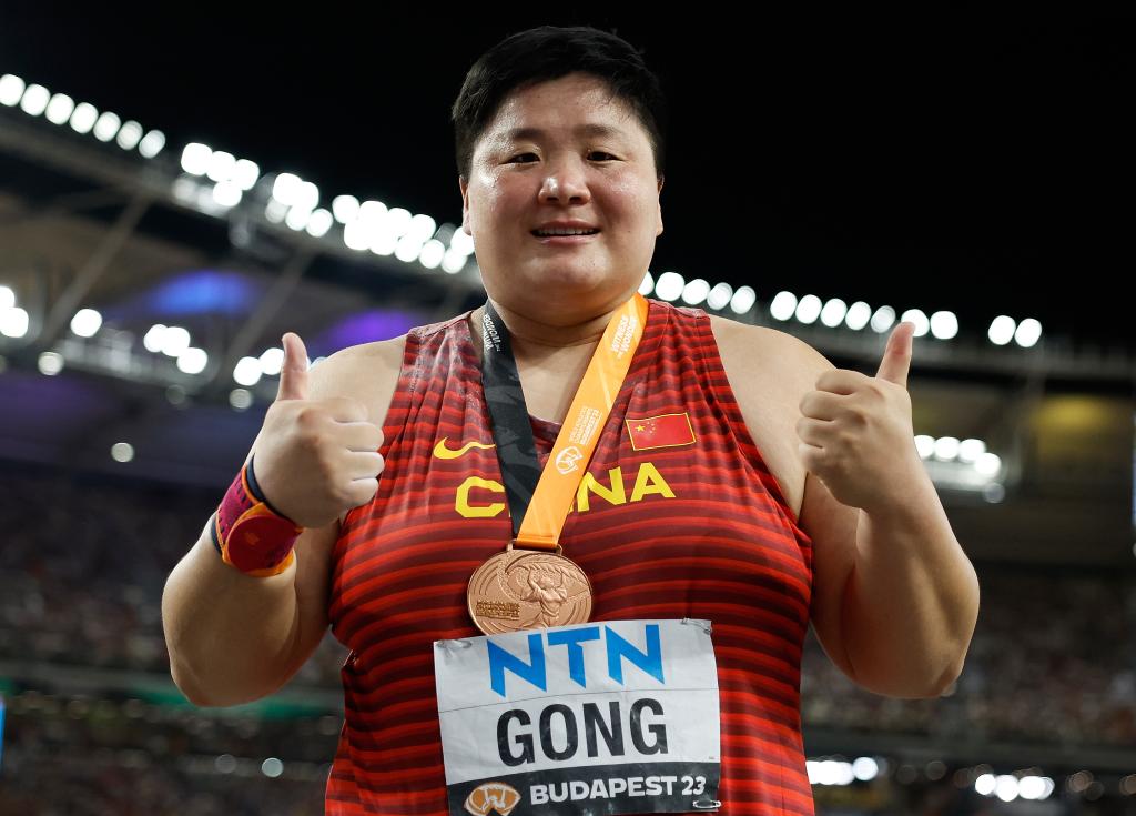 8月26日,中國選手鞏立姣在決賽后慶祝。當日,在匈牙利布達佩斯舉行的2023世界田徑錦標賽女子鉛球決賽中,中國選手鞏立姣以19米69的成績獲得季軍。新華社記者王麗莉攝