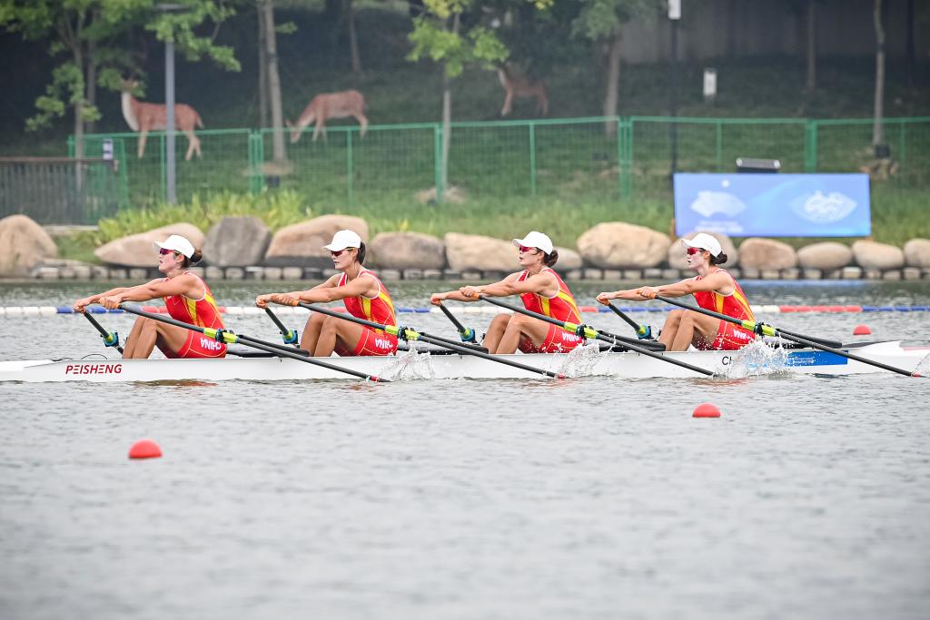 在女子四人雙槳決賽中,陳云霞、張靈、呂揚(yáng)、崔曉桐組成的奧運(yùn)冠軍組合,以6分42秒84的成績奪冠,伊朗隊(duì)和越南隊(duì)分獲二、三名。