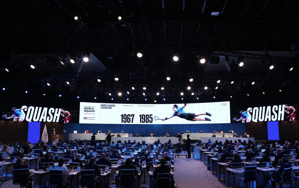 這是10月16日在印度孟買舉行的國際奧委會第141次全會現(xiàn)場大屏幕展示的壁球項目。新華社記者 曹燦 攝