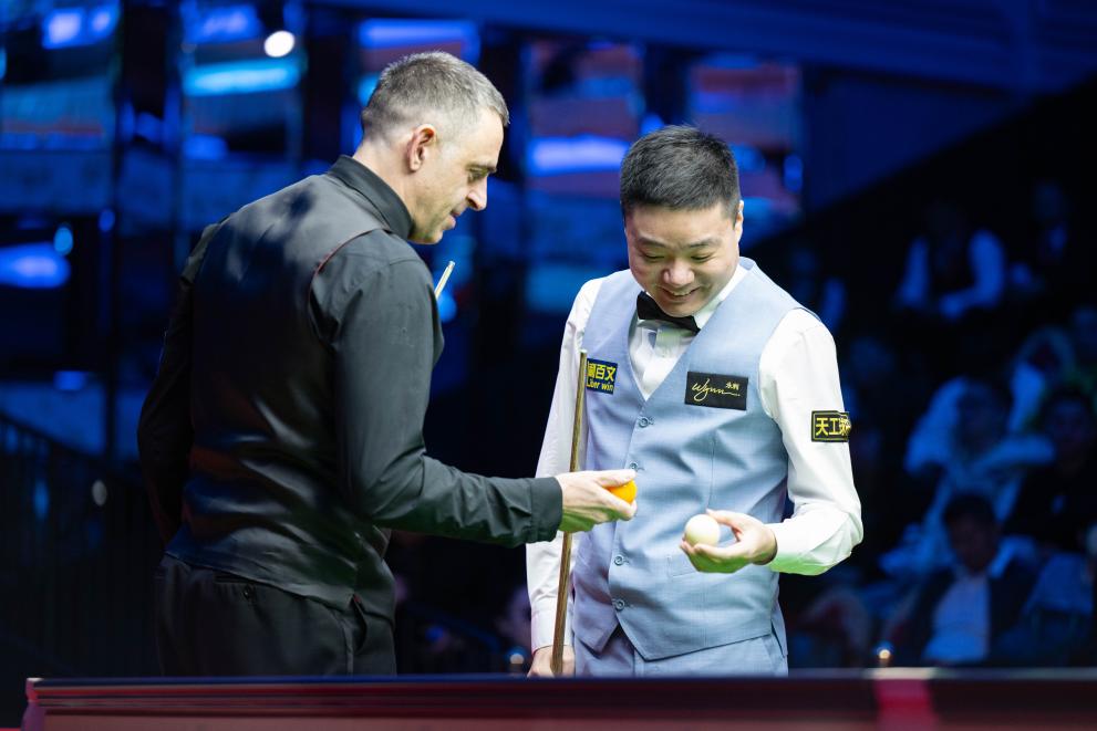 12月25日,奧沙利文(左)與丁俊暉在表演賽中。當(dāng)日,2023年澳門斯諾克大師邀請(qǐng)賽拉開帷幕。新華社記者 張金加 攝