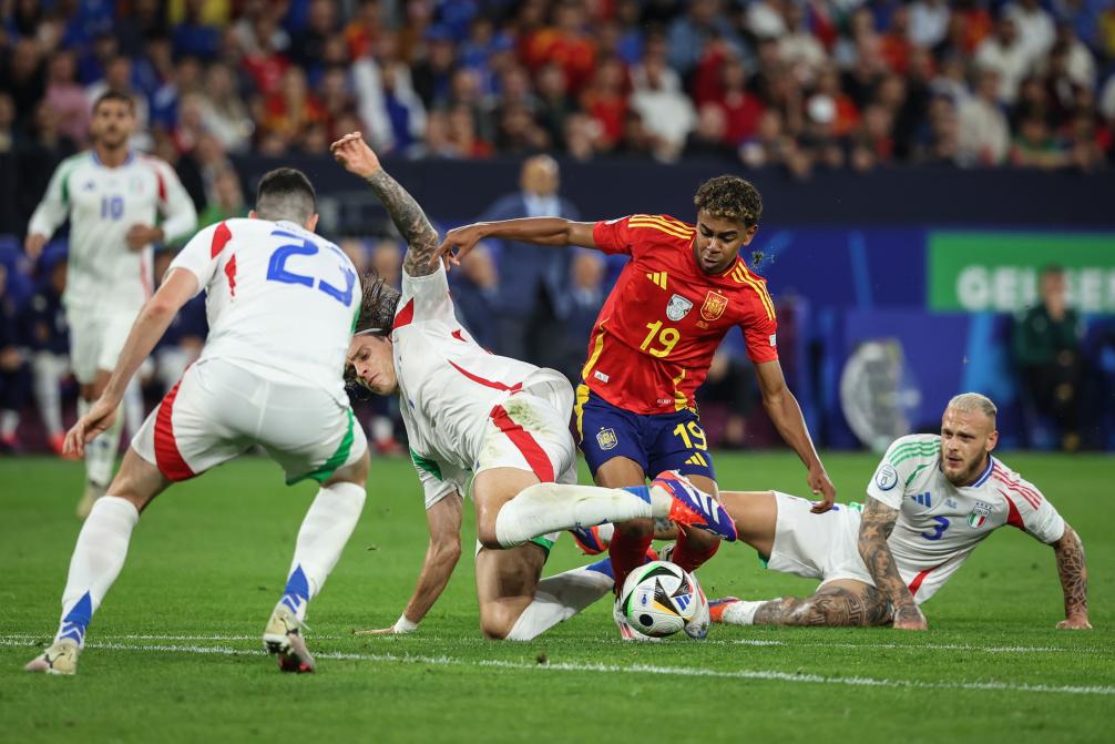 6月20日,西班牙隊(duì)球員亞馬爾(右二)在比賽中帶球突破。當(dāng)日,在德國蓋爾森基興進(jìn)行的2024歐洲足球錦標(biāo)賽B組次輪比賽中,西班牙隊(duì)1比0戰(zhàn)勝意大利隊(duì)。新華社記者 潘昱龍 攝