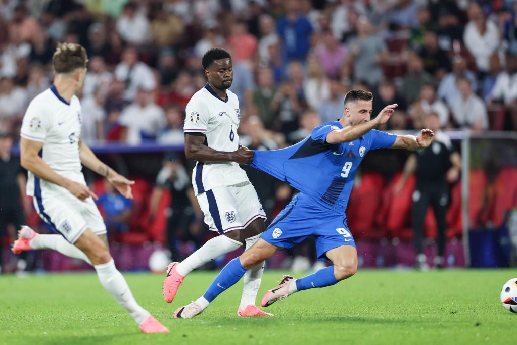 6月25日,英格蘭隊(duì)球員格希(中)在比賽中犯規(guī)。當(dāng)日,在德國科隆進(jìn)行的2024歐洲足球錦標(biāo)賽C組第三輪比賽中,英格蘭隊(duì)0比0戰(zhàn)平斯洛文尼亞隊(duì)。新華社記者 白雪飛 攝