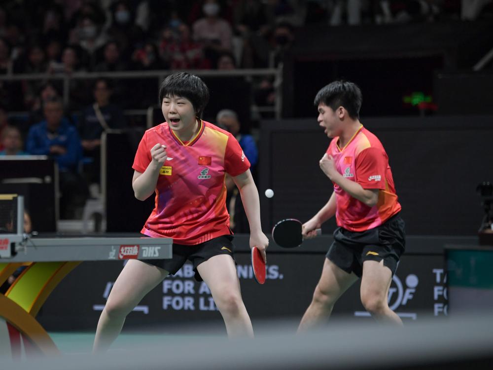 12月5日,中國隊(duì)組合王楚欽(左)/孫穎莎在混雙比賽中。新華社記者 江宏景 攝