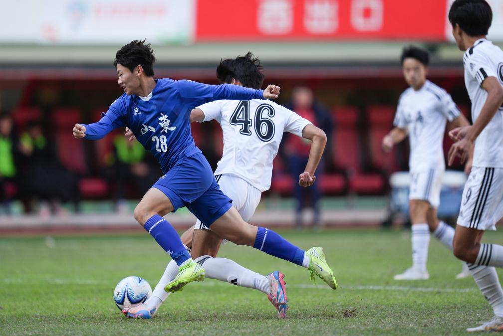 11月27日,山東隊球員陳子涵(左一)在比賽中進(jìn)攻。當(dāng)日,在第一屆青少年三大球運(yùn)動會足球項目男子金牌賽中,山東隊1:0勝上海隊,奪得冠軍。新華社記者 薛宇舸 攝