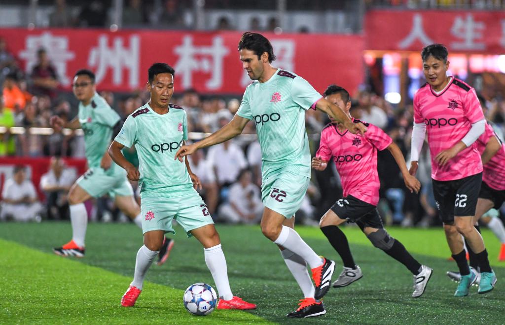 5月27日,卡卡(中)在“逐夢”冠軍明星公益賽中。當(dāng)日,“逐夢”冠軍公益賽在貴州省黔東南苗族侗族自治州榕江縣“村超”球場舉行。新華社記者 楊文斌 攝