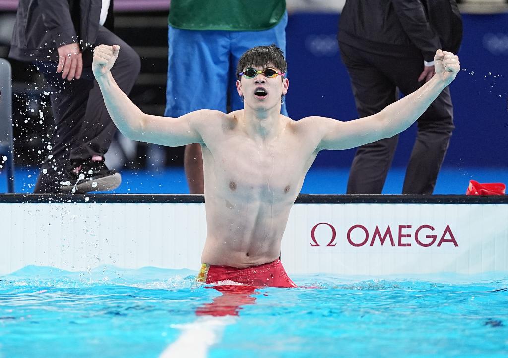 這是2024年7月31日,中國(guó)選手潘展樂(lè)在巴黎奧運(yùn)會(huì)游泳項(xiàng)目男子100米自由泳決賽后慶祝。新華社記者 杜宇 攝
