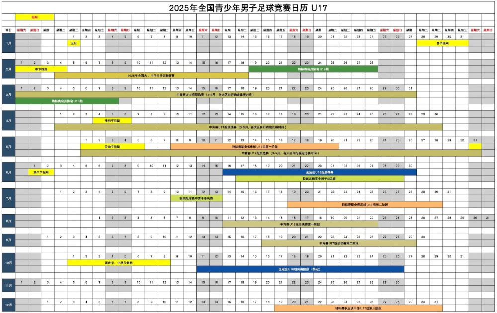 中國(guó)足協(xié)此次發(fā)布的統(tǒng)一賽歷涉及男子U13至U18共6個(gè)年齡段和女子U14至U18共5個(gè)年齡段的球員,包含中青賽、體校杯、職業(yè)俱樂部梯隊(duì)的比賽、校園足球高中男女總決賽等。不同賽事用不同顏色標(biāo)注,在表格中一目了然。中國(guó)足協(xié)青少部負(fù)責(zé)人程旭表示,這份賽歷是各部門共同推進(jìn)的結(jié)果,不僅有助于賽事統(tǒng)籌和優(yōu)化,也能更好地凝聚力量,完善人才培養(yǎng)。