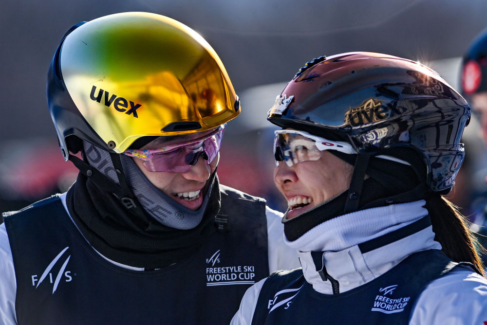 2月24日,中國隊李天馬(左)與徐夢桃在比賽后慶祝。新華社記者 顏麟蘊 攝