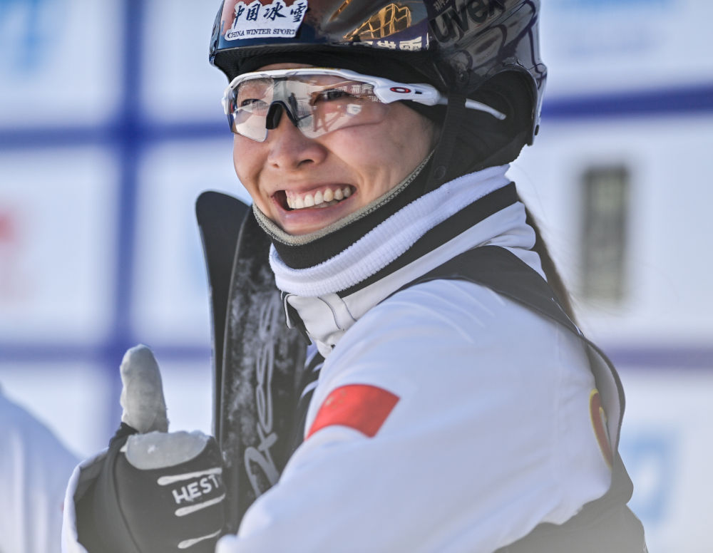 2月24日,中國隊徐夢桃在比賽后慶祝。新華社記者 顏麟蘊 攝