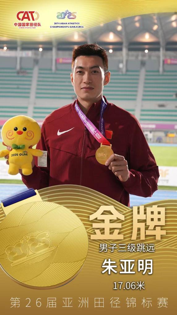 梁小靜奪冠后慶祝。圖源:中國田徑隊(duì) 男子三級跳遠(yuǎn)比賽中,東京奧運(yùn)會(huì)銀牌得主朱亞明第一輪就跳出17米06的成績,奠定勝局。他也是全場比賽唯一突破17米的運(yùn)動(dòng)員,此后第二輪中朱亞明還跳出過17米01。獲得亞軍的印度選手奇斯拉韋爾成績是16米90。