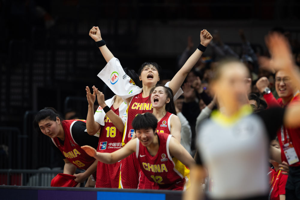 3月15日,在武漢舉行的2026年女籃世界杯資格賽A組比賽中,中國(guó)隊(duì)84:74戰(zhàn)勝捷克隊(duì)。圖為中國(guó)隊(duì)球員在場(chǎng)邊慶祝得分。新華社記者 肖藝九 攝