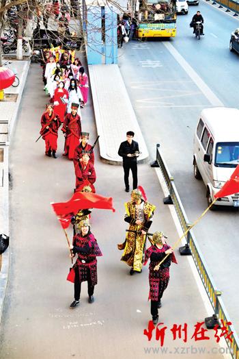 男的身披戰(zhàn)袍鎧甲,女的一襲古裝長(zhǎng)裙,一支戰(zhàn)國(guó)時(shí)代的隊(duì)伍揮舞旗幟、佩帶長(zhǎng)劍從忻州城區(qū)七一路走過(guò)?!笆遣皇桥碾娨晞×耍俊边^(guò)往行人紛紛側(cè)目觀望。