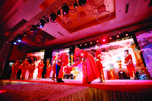 “秉父母之命,承媒妁之言,今日,新人喜結(jié)連理,諸賓共睹,天地同鑒,于此,新人三拜。一拜,感天地之造化,緣分天賜,德行地載。愿天地賜福,婚姻美滿,天長地久。再拜,婚姻之意義,為延續(xù)生命,推進(jìn)文明。上以繼父母之血統(tǒng),下以開萬代之文化。三拜,今夕何夕,得此良人。愿此生忠貞不二,矢志不渝。”在滔滔黃河和大紅燈籠的映襯之下,一對身著中式婚禮服的新人隆重登場。鳳冠霞帔、紅花禮帽,古樸而莊重,喜氣又脫俗。民歌《想親親》道出了一對新人浪漫甜蜜的愛情故事,悠揚(yáng)嘹亮的嗩吶聲吹響了幸福的號角,一對甜蜜的新人在親朋好友的簇?fù)碇逻~入洞房。中式婚禮秀《想親親》讓現(xiàn)場的每一位觀眾感同身受,秀容大地的獨(dú)特風(fēng)俗文化在一場婚禮秀中體現(xiàn)得淋漓盡致。
