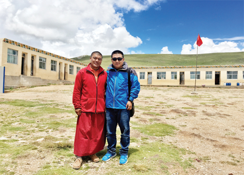在青海玉樹念經(jīng)湖小學(xué)慈善捐贈后與校長合影留念
