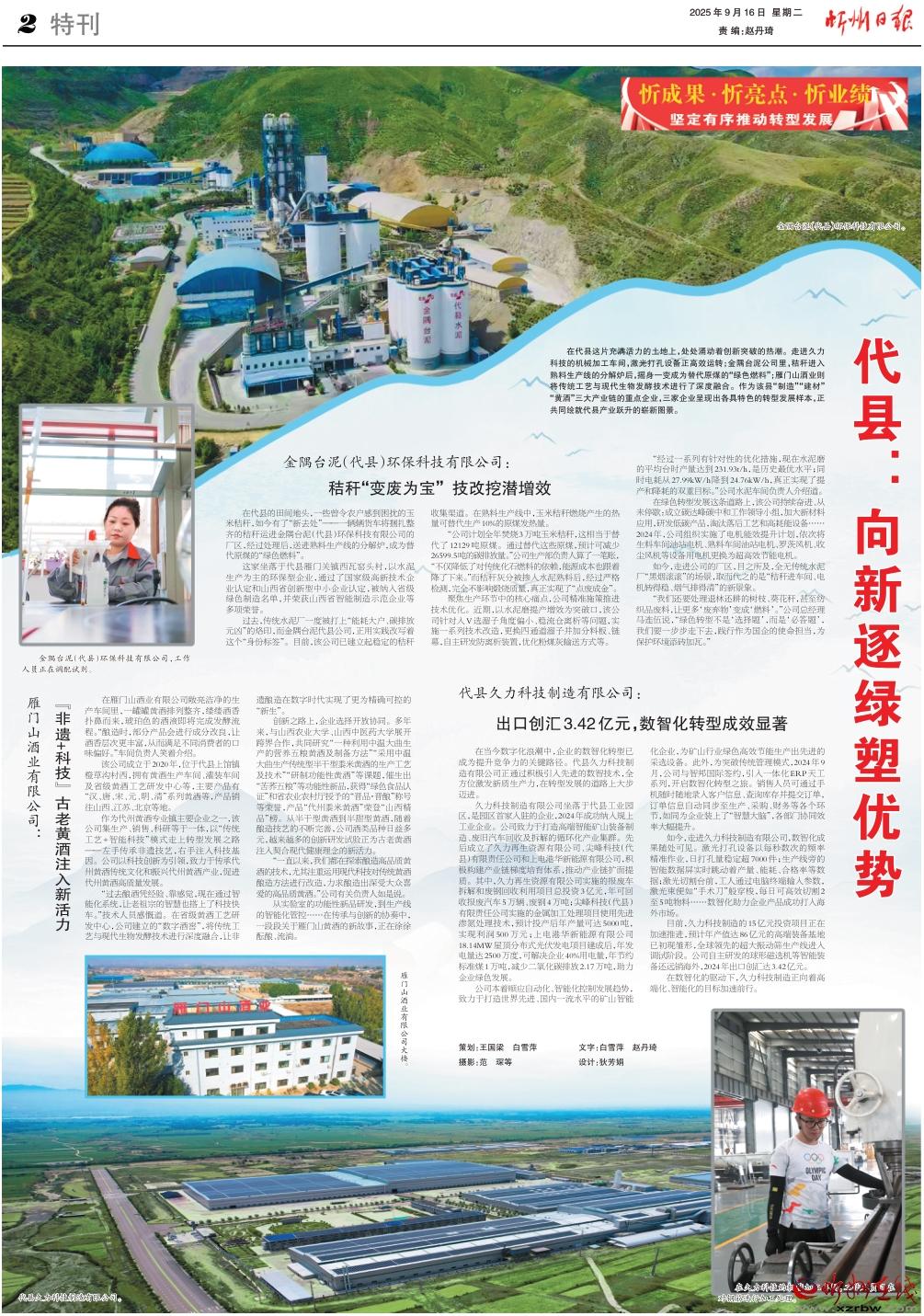 在代縣這片充滿活力的土地上,處處涌動(dòng)著創(chuàng)新突破的熱潮。走進(jìn)久力科技的機(jī)械加工車間,激光打孔設(shè)備正高效運(yùn)轉(zhuǎn);金隅臺(tái)泥公司里,秸稈進(jìn)入熟料生產(chǎn)線的分解爐后,搖身一變成為替代原煤的“綠色燃料”;雁門(mén)山酒業(yè)則將傳統(tǒng)工藝與現(xiàn)代生物發(fā)酵技術(shù)進(jìn)行了深度融合。作為該縣“制造”“建材”“黃酒”三大產(chǎn)業(yè)鏈的重點(diǎn)企業(yè),三家企業(yè)呈現(xiàn)出各具特色的轉(zhuǎn)型發(fā)展樣本,正共同繪就代縣產(chǎn)業(yè)躍升的嶄新圖景。