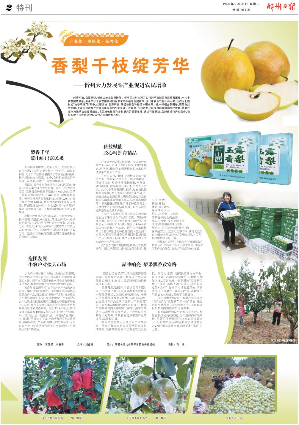 時(shí)值仲秋,白露已過,忻州大地上梨香陣陣。忻府區(qū)蘭村鄉(xiāng)河習(xí)頭村的千畝梨園已是碩果壓枝,一片豐收在望的景象;原平市子干鄉(xiāng)東南賈村的標(biāo)準(zhǔn)化梨園基地規(guī)整有序,現(xiàn)代化農(nóng)業(yè)氣息撲面而來;忻府區(qū)北趙村的“老李君睞”梨園中,紅梨滿枝,色澤鮮亮,展現(xiàn)著特色種植的豐碩成果。這一幅幅金秋畫卷,既是自然的饋贈(zèng),更是忻州市梨產(chǎn)業(yè)高質(zhì)量發(fā)展的生動(dòng)見證。近年來,忻州市充分發(fā)揮自然稟賦和傳統(tǒng)優(yōu)勢(shì),將梨產(chǎn)業(yè)作為推動(dòng)農(nóng)業(yè)提質(zhì)增效、農(nóng)民增收致富和鄉(xiāng)村振興的重要支柱,通過科技驅(qū)動(dòng)、品牌建設(shè)和產(chǎn)業(yè)融合,穩(wěn)步實(shí)現(xiàn)了從傳統(tǒng)果業(yè)向現(xiàn)代產(chǎn)業(yè)的轉(zhuǎn)型升級(jí)。