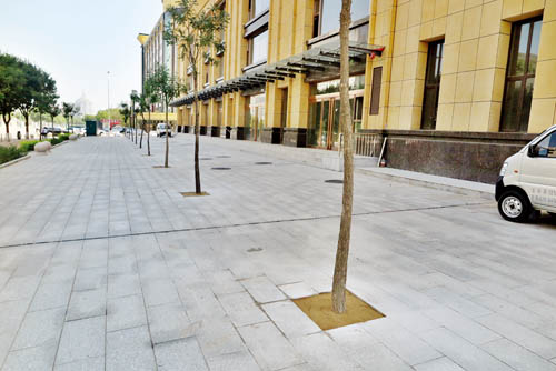 據(jù)了解,因?yàn)樵撆R街大樓是轉(zhuǎn)角建筑,相鄰七一路樓前還栽有13棵景觀樹(shù),工人們將在7日下午為這些樹(shù)木切割設(shè)置相同規(guī)格的樹(shù)池。圖為有了澆水池的樹(shù)木(魯明強(qiáng))