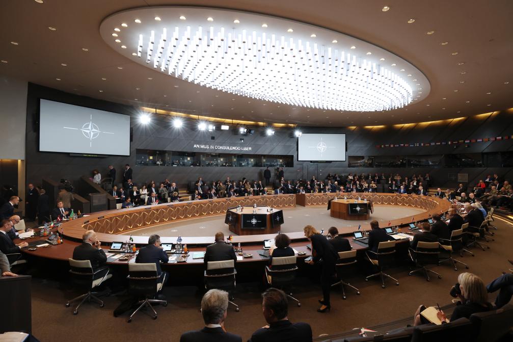 這是6月14日在比利時(shí)布魯塞爾北約總部拍攝的北約防長(zhǎng)會(huì)現(xiàn)場(chǎng)。北約秘書(shū)長(zhǎng)斯托爾滕貝格14日說(shuō),北約成員國(guó)國(guó)防部長(zhǎng)當(dāng)天批準(zhǔn)了一項(xiàng)旨在由北約協(xié)調(diào)對(duì)烏克蘭軍事援助和訓(xùn)練的計(jì)劃。北約防長(zhǎng)會(huì)13日至14日在布魯塞爾舉行。新華社記者趙丁喆攝