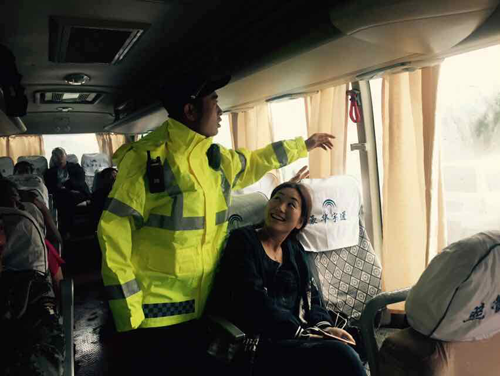 外勤稽查在檢查客車逃生設備