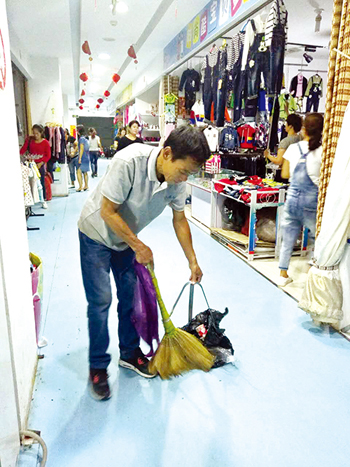 整個云河商場只有一層,共60多家商戶,衛(wèi)生清潔一天3次,工作量雖然不是很大,卻也不輕松。記者見到老馬時,他正在做商場關(guān)門前的最后一次清掃。不時有商戶喊老馬過去收紙箱和塑料袋,老馬加快了手里的動作。“商場是公共場所,管理也挺嚴格的,我得隨時注意看哪里有了垃圾,或是公共設(shè)施出了問題,要不人來人往怕出事。干凈整潔的環(huán)境代表著商場的形象,也能讓顧客購物時有個好心情,這也是我工作的價值吧?!崩像R坦言,有的人衛(wèi)生習慣特別不好。商場里童裝生意最為火爆,有個別帶孩子的家長直接讓孩子隨地大小便,不僅弄臟了環(huán)境也作了不良示范。老馬希望通過創(chuàng)衛(wèi),大家愛護環(huán)境衛(wèi)生的意識得到提高,這樣他也可以輕松點了。(王菲)
