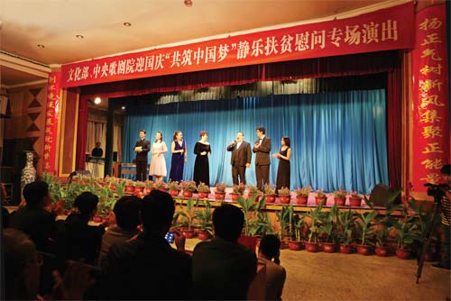 日前,文化部、中央歌劇院在靜樂縣舉辦了迎國(guó)慶“共筑中國(guó)夢(mèng)”扶貧慰問(wèn)專場(chǎng)演出。中央歌劇院的藝術(shù)家與當(dāng)?shù)馗刹咳罕娡_(tái)獻(xiàn)藝,共同重溫紅色經(jīng)典,熱情謳歌黨的光輝業(yè)績(jī)。整場(chǎng)演出薈萃眾多藝術(shù)名家,演員們激情演唱了《我們走在大路上》《我為祖國(guó)獻(xiàn)石油》《打起手鼓唱起歌》《草原上升起不落的太陽(yáng)》等膾炙人口的經(jīng)典老歌,引起了觀眾強(qiáng)烈的共鳴,現(xiàn)場(chǎng)掌聲、歡呼聲、叫好聲連綿不斷。演出不僅給當(dāng)?shù)厝罕妿?lái)一場(chǎng)精彩紛呈的文化盛宴,也激勵(lì)了干群齊心協(xié)力打好脫貧攻堅(jiān)戰(zhàn)的斗志,增強(qiáng)了百姓實(shí)現(xiàn)全面脫貧、全面小康的信心和決心。(小敏 攝)