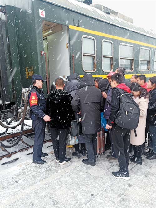 1月5日,五寨縣普降大雪。五寨火車站派出所民警冒雪維護秩序,指揮疏導(dǎo)交通,確保旅客在客流高峰期安全乘車。(索效剛 攝)