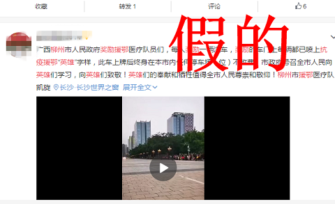 在一些微信群里,“柳州市獎(jiǎng)勵(lì)援鄂醫(yī)療隊(duì)員們,每人獎(jiǎng)勵(lì)一輛汽車,獎(jiǎng)勵(lì)的車門上每輛都已噴上抗疫援鄂‘英雄’字樣,此車上牌后終身在本市內(nèi)任何停車場(位)不收費(fèi)”的信息比比皆是。在抖音和微博平臺(tái),還有不少網(wǎng)友以該信息為基礎(chǔ),配上了迎接援鄂抗疫英雄回柳的畫面,制作成了短視頻在網(wǎng)絡(luò)上傳播,加劇了虛假信息進(jìn)一步傳播。