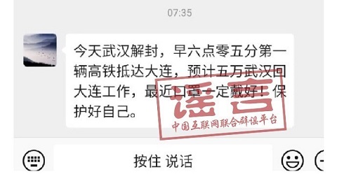 真相:4月7日-8日,北京市委教育工委、市教委及西城區(qū)委教育工委、區(qū)教委先后表示,相關(guān)消息都是虛假信息。目前,北京市委教育工委、市教委正在分批次、分類型做開學(xué)準備工作,制定各批次、各年級開學(xué)詳細計劃。同時,從4月13日起,北京春季學(xué)期將實現(xiàn)“線上線下”無縫銜接,建立與疫情防控常態(tài)化相適應(yīng)的課程教學(xué)機制。近期,市委教育工委、市教委將公布具體開學(xué)時間,請大家以官方微信公號“首都教育”等權(quán)威發(fā)布為準。 三、武漢解封,預(yù)計五萬武漢人回大連工作? 4月8日,有消息稱:“今天武漢解封,早六點零五分第一輛高鐵抵達大連,預(yù)計五萬武漢人回大連工作,最近口罩一定戴好……”。