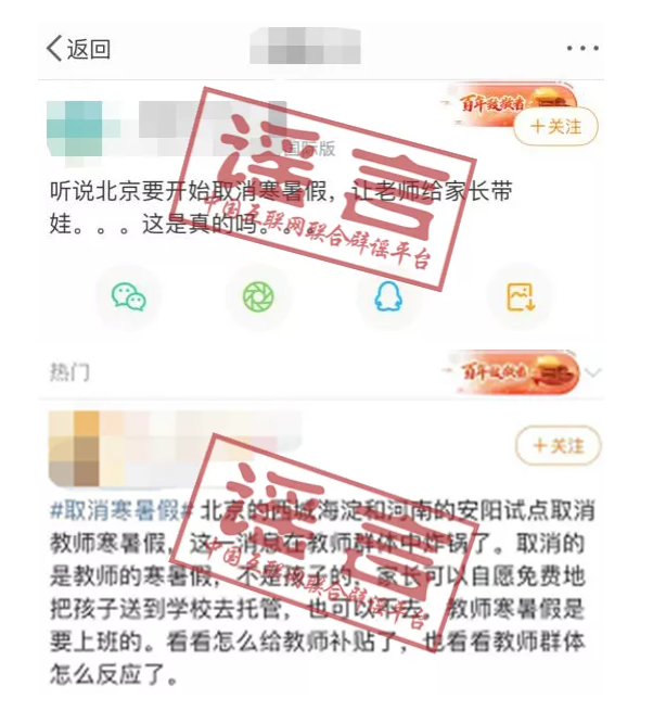 中國互聯(lián)網(wǎng)聯(lián)合辟謠平臺第一時間向教育部相關(guān)部門求證,確認(rèn)“北京、河南試點(diǎn)取消教師寒暑假”為不實(shí)消息。