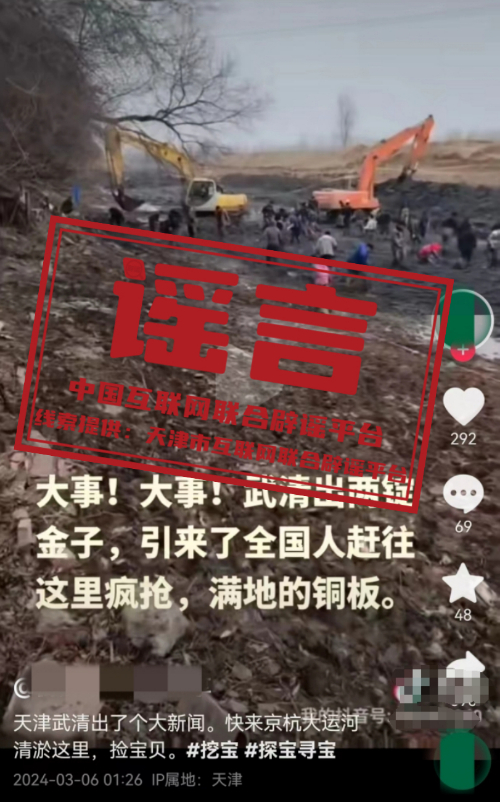 謠言:天津武清北運河城區(qū)段清淤挖出寶?