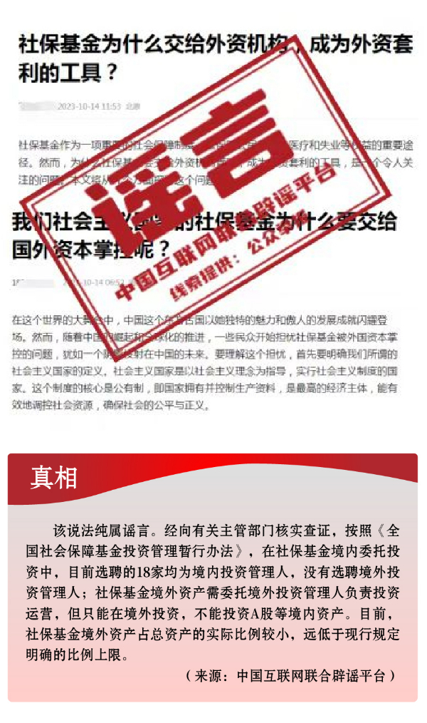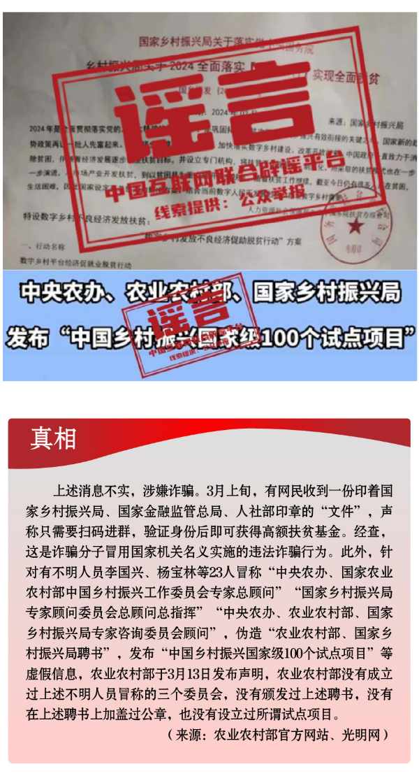 假冒權(quán)威杜撰政策類謠言,誤導(dǎo)公眾。3月以來,一些不法分子或機構(gòu)打著權(quán)威旗號,假冒國家機關(guān)、偽造政府公文、歪曲解讀政策,企圖行騙牟利。如,詐騙分子冒用國家機關(guān)名義,假稱“國家發(fā)放2024年鄉(xiāng)村振興扶貧補貼”“鄉(xiāng)村振興項目有國家級試點100個”“‘退稅綠色通道’加快退稅到賬速度”等,實施違法詐騙行為,給社會公眾造成極大信息和資金安全風(fēng)險。還有人制造、傳播“我國城鄉(xiāng)居民醫(yī)保參保人數(shù)近年來持續(xù)下降,部分地區(qū)農(nóng)村出現(xiàn)醫(yī)保退保潮”“失業(yè)保險金只能領(lǐng)一次,最多領(lǐng)24個月”“我國社保基金全都交給外資機構(gòu)管理”等一系列與事實嚴(yán)重不符的涉公共謠言,迷惑性大、蠱惑性強,極易誤導(dǎo)公眾,對我國現(xiàn)有社保政策和相關(guān)工作造成負面影響。
