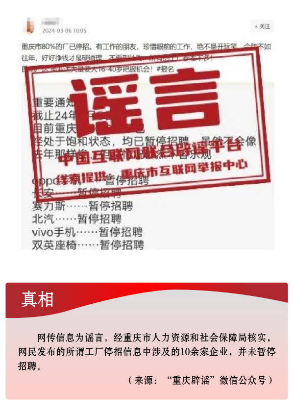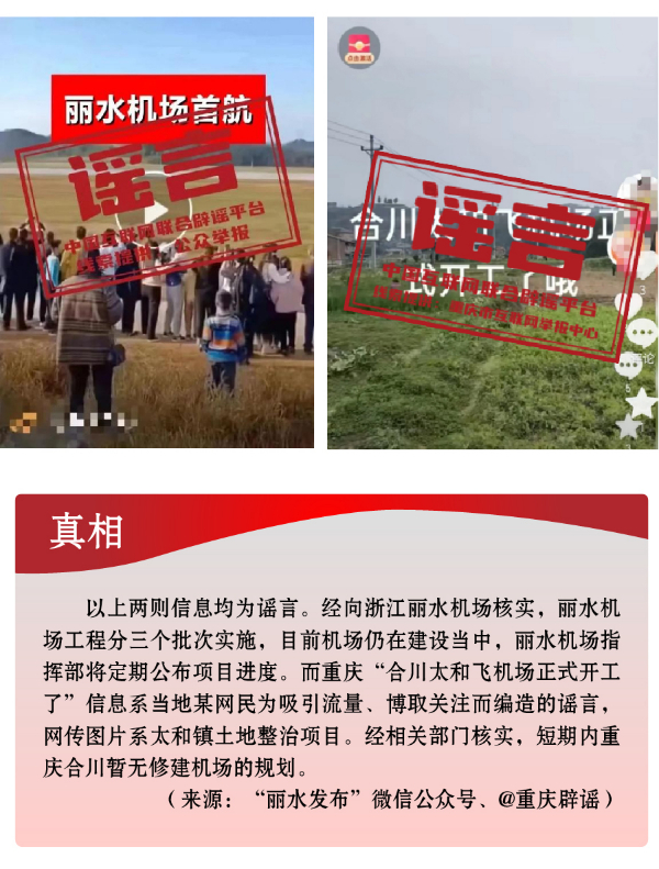 搭蹭熱點散播民生類謠言,渲染焦慮。3月,全國兩會召開,“民生清單”熱度高?!按赫小薄按河巍钡葧r間節(jié)點,有關(guān)招工就業(yè)、疫病傳染等內(nèi)容也成為個別網(wǎng)民博眼球的素材。一些個人或自媒體歪曲甚或虛構(gòu)事實,編造散布社會民生謠言,引發(fā)公眾不必要的焦慮。如,別有用心者惡意虛構(gòu)事實,發(fā)布“重慶80%的工廠暫停招聘”“湖南郴州疫情卷土重來”等虛假信息,渲染負面情緒、徒增公眾憂慮、擾亂社會秩序;還有人為吸引流量、博取關(guān)注,根據(jù)主觀臆想,采取移花接木等手段,散播“京滬高速公路停止收費”“浙江麗水機場已建成投用并首航”“重慶合川太和飛機場正式開建”等涉重大基礎(chǔ)設(shè)施建設(shè)項目的假消息,誤導(dǎo)公眾認(rèn)知,擾亂群眾交通出行秩序。