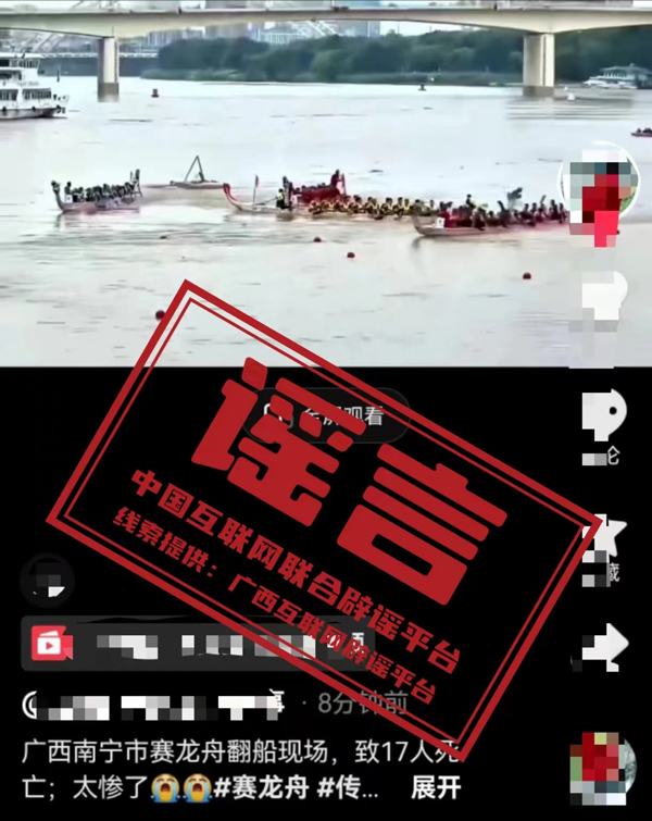 真相:近日,有網(wǎng)友在短視頻平臺發(fā)視頻稱“南寧市賽龍舟翻船致人員傷亡”。經(jīng)廣西壯族自治區(qū)南寧市互聯(lián)網(wǎng)舉報辟謠平臺向南寧市體育局核實,大賽期間,南寧市紅十字會、南寧市應(yīng)急管理局和消防救援支隊安排50余名持有救生員資格證的救生人員、10臺救生艇隨時待命,比賽期間發(fā)生賽艇傾覆的緊急情況后,應(yīng)急救援隊第一時間組織救援力量開展施救,成功地將傾覆的賽艇和落水運動員一一救起,未致人員傷亡。網(wǎng)傳“南寧市賽龍舟翻船致人員傷亡”系謠言。(來源:廣西互聯(lián)網(wǎng)違法和不良信息舉報、“南寧舉報辟謠”微信公眾號)