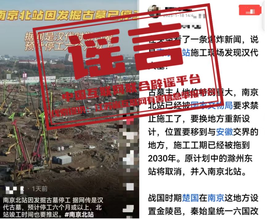 真相:近日,有網民在網絡平臺發(fā)帖稱,南京北站因挖到古墓,“已經被國家文物局要求禁止施工了”“預計停工六個月或以上”“施工工期已經被拖到2030年”等。經江蘇省互聯網辟謠平臺與省文物部門和屬地核實,目前沒有收到國家文物局關于“南京北站禁止施工”的有關通知,南京北站除個別涉及考古發(fā)掘作業(yè)區(qū)域外,其他施工作業(yè)均按計劃正常有序推進,網傳信息系謠言。(來源:江蘇省互聯網辟謠平臺、“南京網絡辟謠”微信公眾號)