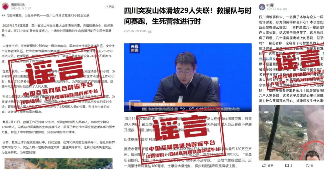 詳情:2025年2月8日,四川宜賓筠連發(fā)生山體滑坡已造成1人遇難、28人失聯(lián),2人受傷。全民救援關(guān)鍵時(shí)刻,部分網(wǎng)民為吸引流量博取關(guān)注,在網(wǎng)上捏造不實(shí)信息、散布災(zāi)情謠言、混淆大眾視聽(tīng),不僅擾亂了社會(huì)公共秩序,更對(duì)救援工作造成困擾。