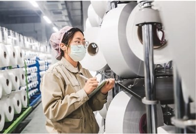 江蘇省宿遷市泗陽縣近年來加快推動(dòng)紡織企業(yè)生產(chǎn)數(shù)字化轉(zhuǎn)型,實(shí)現(xiàn)高質(zhì)量發(fā)展。圖為江蘇芮邦科技有限公司生產(chǎn)車間內(nèi),工人在智能化生產(chǎn)線上作業(yè)。裴 成攝(人民視覺)
