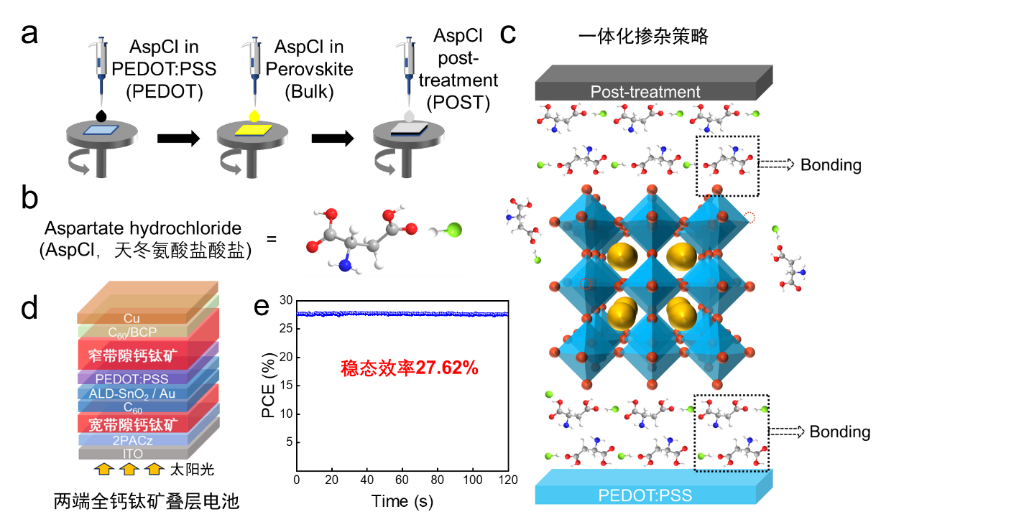 經過長期攻關,武漢大學物理科學與技術學院柯維俊教授、方國家教授團隊在探索全鈣鈦礦疊層太陽能電池性能提升方面有了新進展,創(chuàng)造性提出天冬氨酸鹽酸鹽一體化摻雜策略,有效提高了窄帶隙鈣鈦礦子電池的效率和穩(wěn)定性,為進一步提升電池性能找到新途徑。相關研究成果近日發(fā)表在《自然》雜志上。 據介紹,新型金屬鹵化物鈣鈦礦具有制備工藝簡單、缺陷容忍度高、吸收系數高、載流子擴散長度長等優(yōu)點,在光電子器件領域備受關注,被業(yè)內認為是極具前景的下一代光伏材料之一。 論文通訊作者之一、武漢大學物理科學與技術學院教授柯維俊表示,在實際應用中,全鈣鈦礦疊層太陽能電池由頂部的寬帶隙鈣鈦礦子電池和底部的窄帶隙鈣鈦礦子電池一體化疊加而成,而其中不夠優(yōu)異的窄帶隙鈣鈦礦子電池是其未來實現商業(yè)化應用的絆腳石之一。 為此,研究團隊將天冬氨酸鹽酸鹽引入到全鈣鈦礦疊層太陽能電池底部的空穴傳輸層、鈣鈦礦體吸光層和上界面層中,開發(fā)了一種采用同一分子處理的一體化摻雜策略,極大地改善了鈣鈦礦薄膜的質量。除了與鈣鈦礦前驅體配位外,天冬氨酸鹽酸鹽分子還具有很強的分子間氫鍵,富集在鈣鈦礦上、下界面處的天冬氨酸鹽酸鹽因此充當了鈣鈦礦層和傳輸層界面之間的分子鎖,進一步提升了鈣鈦礦材料的性能和穩(wěn)定性。 此外,如何抑制窄帶隙鈣鈦礦子電池中不穩(wěn)定的二價錫金屬離子自發(fā)氧化也是行業(yè)痛點之一。此項研究結果表明天冬氨酸鹽酸鹽可以有效抑制二價錫金屬離子氧化,減少有害的四價錫雜質。不僅如此,天冬氨酸鹽酸鹽的引入還可以鈍化鈣鈦礦材料的缺陷,調節(jié)費米能級,抑制有害的離子遷移等,從而加強器件的性能和穩(wěn)定性。