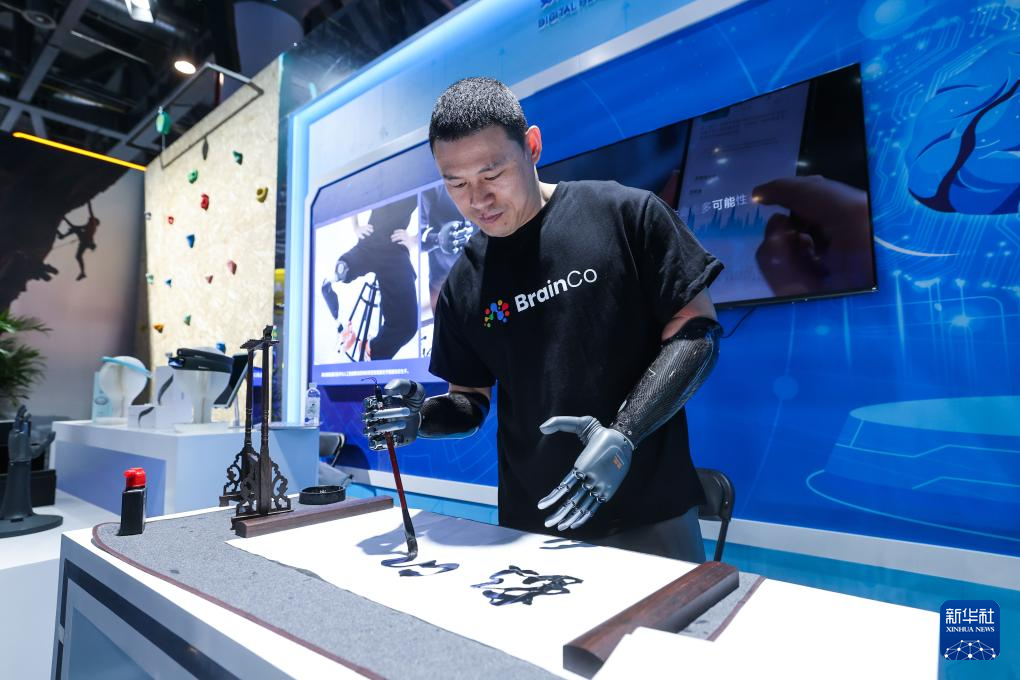 在展位現(xiàn)場,另一名上肢截肢的人士在使用強腦科技推出的智能仿生手。這也是基于非侵入式腦機接口技術的產品。使用者利用智能仿生手不但可輕松取物,還能寫毛筆字。