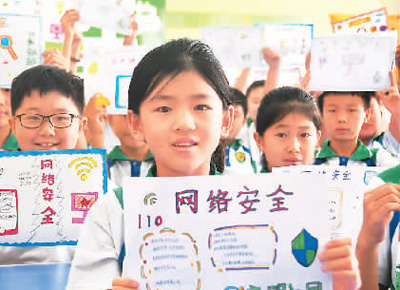 河北省邯鄲市永年區(qū)洺州小學(xué)的孩子們展示網(wǎng)絡(luò)安全手抄報(bào)。胡高雷攝(人民視覺(jué))