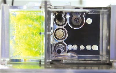 在問天艙生命生態(tài)實驗柜小型受控生命生態(tài)實驗模塊中,魚類、植物和微生物協(xié)同參與——藻類光合作用產生的氧氣供斑馬魚呼吸,魚呼出的二氧化碳供藻類進行光合作用,進食產生的糞便則提供了藻類生長的養(yǎng)料。在飲食方面,科學家專門設計了魚食,用注射器推進“魚缸”。